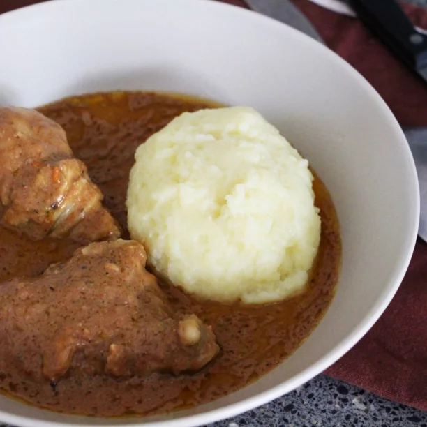 C’est avec ma mère que j’ai préparé cette superbe recette. Elle me prépare ça depuis que je suis petite et c’est facilement, un de mes plats préférés. Chez nous au Bénin, le foufou se nomme « Agoun » et pour l’occaz, comme il est très difficile (et beaucoup plus long) de piler de l’igname en Europe ou ailleurs, on a préparé ce foufou de la manière la plus occidentale et la plus express qui soit! Au goût, c’est tout aussi excellent 😉